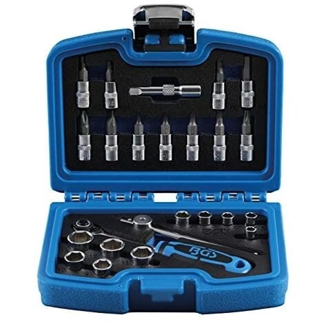 5 douilles à embout, profil T (pour Torx) T10 – T15 – T20 – T25 – T30 | 4 douilles à embout, hexagone femelle 3 – 4 – 5 – 6 mm | 1 douille à embout, cruciforme PH2 | 1 douille à embout, plat 6,5 mm