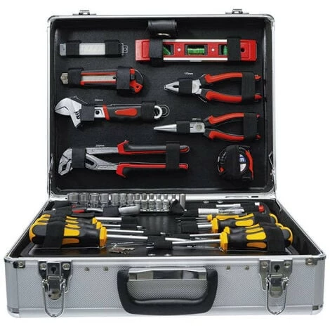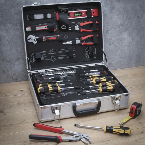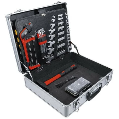 Caisse à outils BGS – Mallette aluminium – 129 pcs – 2204, jeu d’outils dans mallette en aluminium avec fond repliable comprenant un grand nombre d’outils indispensables pour réaliser petits ou grand travaux. Cette petite valise respecte également les règles de sécurité avec son système de fermeture verrouillable.