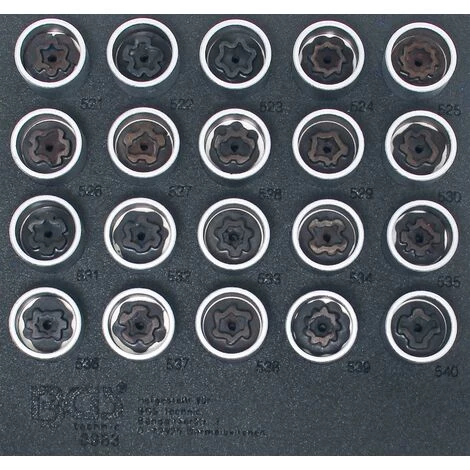 - 20 x douilles à écrous de jantes des tailles suivantes : #521 – #522 – #523 – #524 – #525- #526 – #527 – #528 – #529 – #530- #531 – #532 – #533 – #534 – #535- #536 – #537 – #538 – #539 – #540