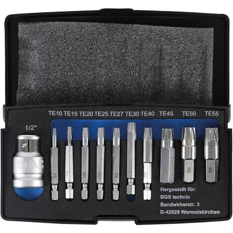 - 7x embouts pour desserrage avec tige de foret six pans pour têtes de vis de profil T (pour Torx) T15 – T20 – T25 – T27 – T30 – T40, longueur : 50 mm