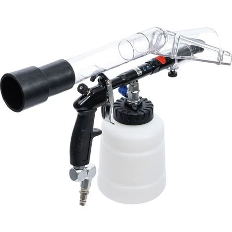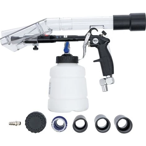 Dispositif combiné en deux parties constitué d’un pistolet de nettoyage rotatif et d’un accessoire d’aspiration Pour nettoyer des surfaces sales telles que des coussins de siège, des tapis de sol Également pour le traitement de surfaces et le nettoyage de véhicules, de jantes et de pièces avec des agents de nettoyage appropriés La buse rotative crée une turbulence d’air ciblée Les surfaces nettoyées sèchent plus rapidement avec la solution de nettoyage finement atomisée Pression de fonctionnement réglable par la roue de réglage Avec accessoire d’aspiration destiné à être utilisé directement sur le pistolet de nettoyage rotatif en tant qu’aspirateur de liquides Fixation de l’accessoire d’aspiration par vis moletée Pour l’aspiration d’agents de nettoyage et d’impuretés dissoutes en une seule opération L’accessoire d’aspiration empêche le liquide appliqué ou le nettoyant de pénétrer en profondeur et assure simultanément un nettoyage direct du dispositif de base Avec ensemble d’adaptateurs de 4 pièces pour le raccordement à différents dispositifs d’aspiration de liquides Vitesse de rotation de la buse : 4000 tr/min Niveau de vibration (ahd) : 1,44 m/s² Niveau de vibration (k) : 0,64 m/s² Étendue de la livraison : 1 pistolet de nettoyage rotatif 1 brosse de nettoyage 1 accessoire d’aspiration pour pistolet pneumatique de nettoyage, grand, avec 4 adaptateurs (art. 70152) Consommation d’air 254 l/min Niveau de pression acoustique max. 89,4 dB(A) Niveau de puissance acoustique max. 99,3 dB(A)