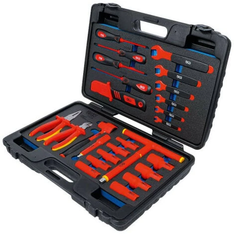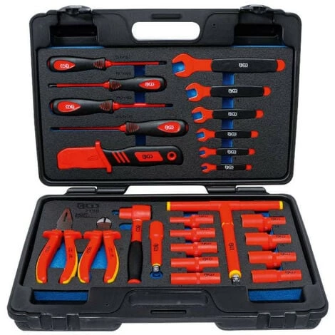 Cette Caisse à outils pour clés à douilles VDE BGS TECHNIC – 26 pcs – 7130 est le coffret tout en 1 qu’il vous faut. Optez pour cet ensemble complet de qualité : cliquets réversibles à denture fine, douilles, rallonges, clés à fourche, couteaux, tournevis et pinces. Tous les outils sont isolés VDE jusqu’à 1000 V pour vous protéger des chocs électriques et garantir votre sécurité. La technologie des pans Pro Torque évite quant à elle l’usure sur les vis à 6 pans et assure une prise parfaite. Le pack parfait pour un électricien ou tout bricoleur. Faits d’acier chrome vanadium, ces outils sont résistants à la corrosion et vous assurent une durabilité pour un usage intensif.