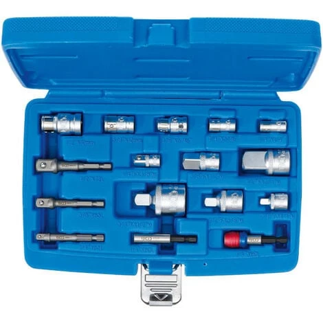 CeJeu d’adaptateurs Ă embout de clĂ© Ă douille BGS TECHNIC – 6779 est composĂ© de 16 pièces qui reprĂ©sentent divers adaptateurs : des adaptateurs Ă embout avec bille de retenue au carrĂ© six pans femelle, des adaptateurs de clĂ©s Ă douille, des adaptateurs pour perçeuse avec empreinte six pans mâle et enfin des porte-embouts. Que des pièces hautement utiles voire indispensables pour bricoler. Faites d’acier chrome-vanadium, ces pièces sont rĂ©sistantes Ă la corrosion et vous assurent une durabilitĂ© pour un usage intensif. Optez pour des outils de qualitĂ© d’une entreprise familiale et traditionnelle aux valeurs fortes, qui propose depuis bientĂ´t 50 ans un large choix d’outillage de mĂ©canique quotidiennement Ă©toffĂ©. La qualitĂ© allemande en plus !